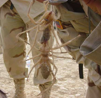 Everyone probably vividly remember the images that came out of Iraq a few years back of what appeared to be some sort of giant arachnid (see bottom below). Those images became an instant Internet sensation, though it was soon revealed that what everyone was getting scared senseless about was actually two camel spiders hooked together, photographed close to the camera so that they appeared to be of gigantic size.